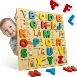 Wooden Alphabet Puzzle Board for Kids – ABC 26 Letters with Phonics & Pictures – Montessori Educational Learning Toy for Toddlers Age 2+ – Colorful Uppercase Letter