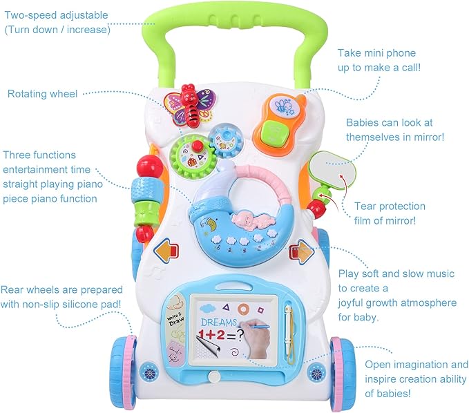 - 👶The baby push walkers has easy-grasp handle which helps steady baby’s first steps, plus 7 hands-on activities including light-up piano, rotating wheel, reversible butterfly, mini phone, mirror, slip bead and magnetic drawing board
