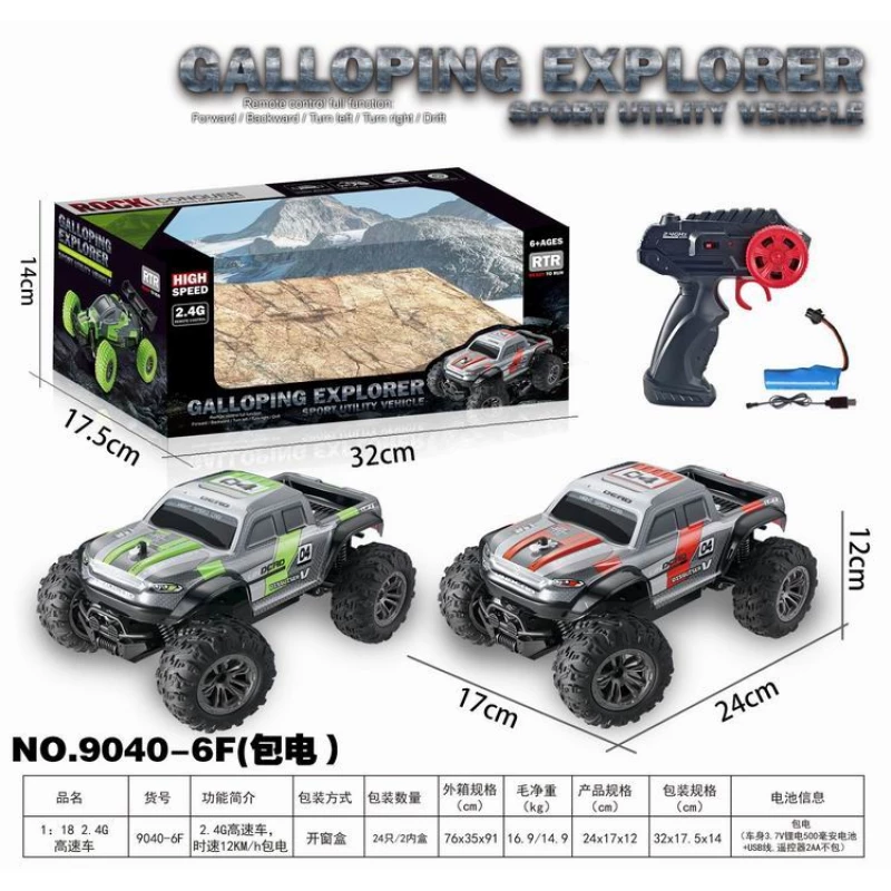 * High-Speed Off-Road Performance: This R/C Sport Utility Vehicle is designed for rugged terrain and high-speed action, capable of reaching speeds of 12 KM/H. * Full Function Control: Features a 2.4 GHz remote control system with full functionality (Forward/Backward, Turn Left/Right, and Drift), along with 4 WD (All-Wheel Drive). * Ready-to-Run (RTR): The NO.9040-6F model is a package that includes the necessary 7.4 V rechargeable lithium battery and USB charging cable, ready to use right out of the box (requires 2×AA batteries for the controller, not included). * Durable Design: Equipped with large, treaded tires and robust construction for climbing and exploring various surfaces. Ideal for children ages 6 and up* High-Speed Off-Road Performance: This R/C Sport Utility Vehicle is designed for rugged terrain and high-speed action, capable of reaching speeds of 12 KM/H. * Full Function Control: Features a 2.4 GHz remote control system with full functionality (Forward/Backward, Turn Left/Right, and Drift), along with 4 WD (All-Wheel Drive). * Ready-to-Run (RTR): The NO.9040-6F model is a package that includes the necessary 7.4 V rechargeable lithium battery and USB charging cable, ready to use right out of the box (requires 2×AA batteries for the controller, not included). * Durable Design: Equipped with large, treaded tires and robust construction for climbing and exploring various surfaces. Ideal for children ages 6 and up